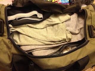 Brad, on the other hand, has absolutely no problems packing. What took me several hours to accomplish took him less than 10 minutes. Folding neatly is not a requirement. Matching clothes is not a requirement. And, looking cute never crosses his mind. Brad packs in a gigantic duffle bag, and it looks something like this.